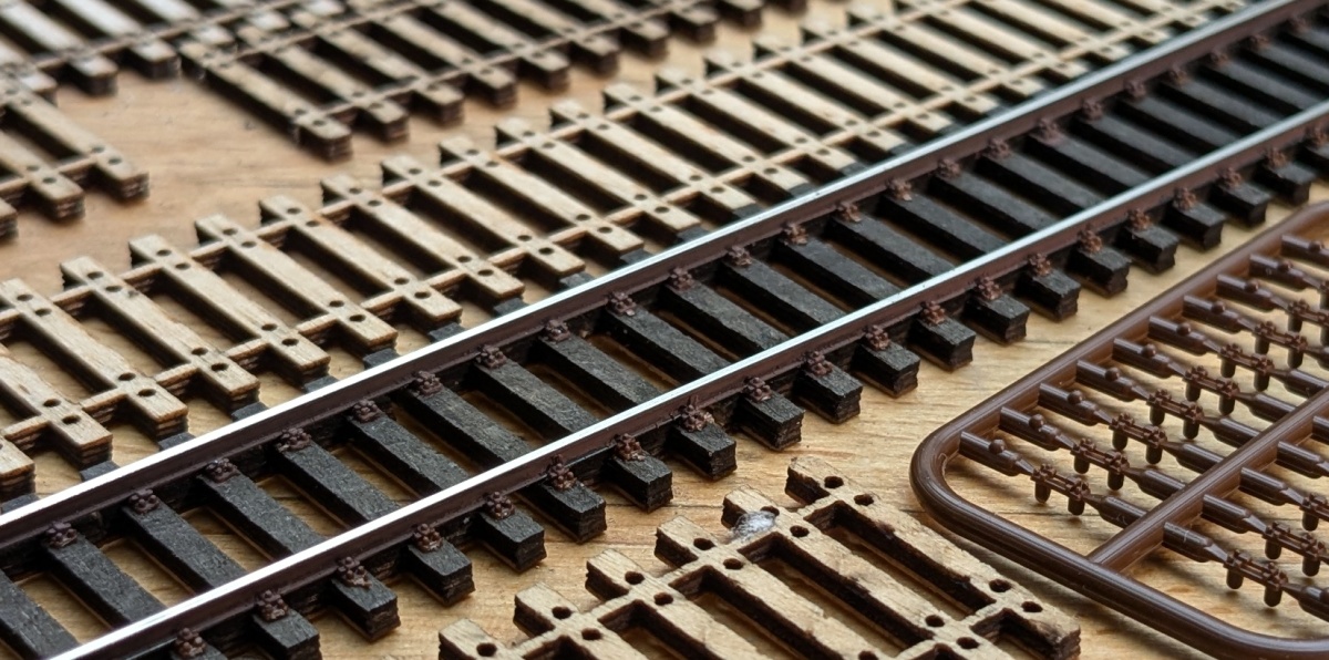 Ich fand es vor allem schwierig die Kleineisen einseitig vom Spritzling zu lösen, um sie dann am restlichen Spritzling fest zu halten und in die vorbereiten Löcher der Schwellenbänder zu drücken. Da sind mir bei den ersten Gleisen viele zerbrochen und ich musste nachbestellen. Aber dann fand ich einen für mich funktionierenden Kniff. Mit einem Stahllineal fixieren und vorsichtig nach oben und unten biegen, voila.